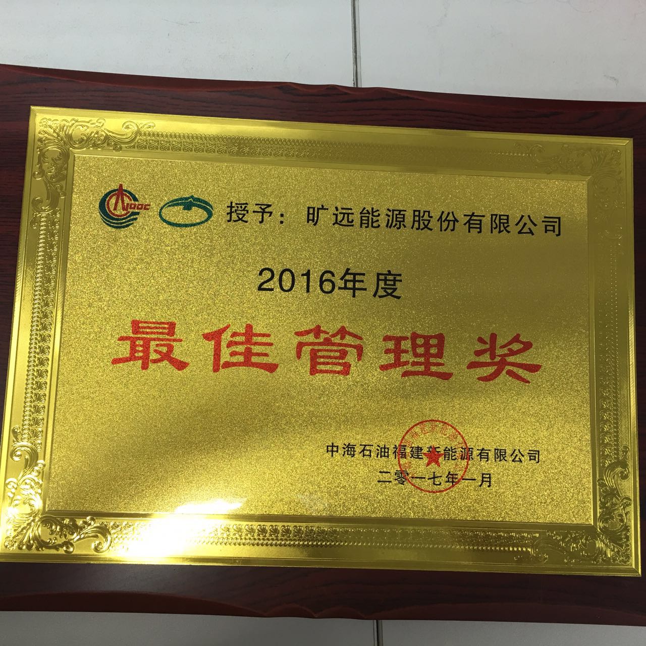 2017年1月      榮獲中海石油福建新能源有限公司頒發(fā)的“2016年度最佳管理獎(jiǎng)”榮譽(yù)證書(shū)。