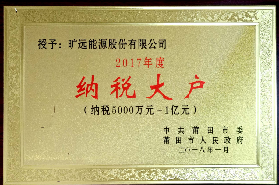 2018年01月      曠遠(yuǎn)能源股份有限公司被中共荔城區(qū)委、荔城區(qū)人民政府授予“2017年度納稅大戶(hù)二等獎(jiǎng)”榮譽(yù)。